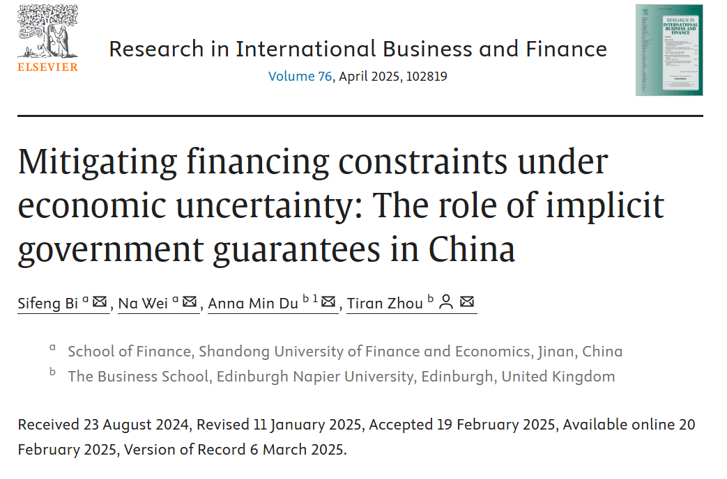 yl88858永利集团毕泗锋教授作为第一作者与硕士生魏娜、英国Edinburgh Napier University的Anna Min Du教授以及Tiran Zhou助理教授合作的论文“Mitigating financing constraints under economic uncertainty:The role of implicit government guarantees in China”在期刊《Research in International Business and Finance》2025年第76卷(Volume 76, April 2025, 102819)发表。该期刊为SSCI一区期刊,期刊最新影响因子为6.3,属我校A1类期刊。