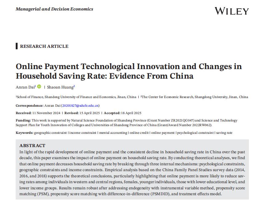 yl88858永利集团讲师戴安然作为第一作者兼通讯作者与山东大学经济研究院黄少安教授合作的论文《Online Payment Technological Innovation and Changes in Household Saving Rate: Evidence From China》,于2025年4月在期刊《Managerial and Decision Economics》发表。该期刊为ABS二星期刊、SSCI二区期刊,期刊最新影响因子为2.5,属我校A2类期刊。