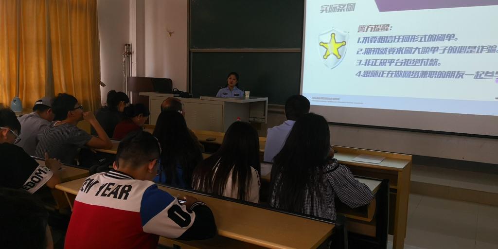 讲座伊始,民警李岚就当今社会中存在的主要电信网络诈骗类型分门别类的进行讲解,结合实例详细讲述了如刷单诈骗、微信诈骗、办理信用卡诈骗、大学生网贷、网络游戏诈骗、冒充公检法等大学生经常遇到的诈骗类型。稍后,李岚以一首防诈骗歌充分调动了现场的气氛,拉近了讲者与听众间的距离。其次,她用一段简短的视频描述了现今网络上泛滥的兼职刷单诈骗,图文并茂地讲解了骗局的具体流程并分析了受骗者上当的心理原因。她重点强调刷单骗局不可信,且国家已针对刷单现象出台相关法律法规,向在座大学生告诫要“抵制诱惑,莫贪小便宜”。同时,向在场学生发放了《致大学生的一封信》,告诫大学生应对诈骗时应沉着冷静,并展示了山东省反电信网络诈骗中心公众号二维码,让同学们可以更全面的掌握防骗技巧。最后,在场民警以自己身边发生的切实案例作出补充,向在座学生再次提醒“不惧恐吓,身正不怕影子斜”,“提高警惕,不要自以为不会受骗”,“遭遇诈骗后一定要报警”,并且就财务领域的诈骗实例为学生们入职后可能面对的诈骗做了预警。