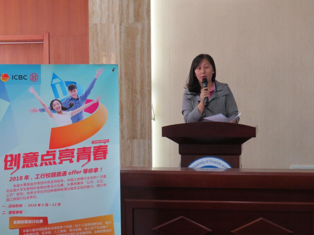 中国工商银行山东省分行信息科技部副总经理张丰胜代表比赛主办方致辞。他肯定了大学生的创新思维,鼓励在座学子们积极踊跃地参加比赛。他期待我校学子在本次创意设计大赛中能够开拓思维、独具匠心,对“银校联合”体制下勇于创业创新的大学生团体寄予厚望。随后,yl88858永利集团团委书记陈静代表比赛承办方致辞。她希望有志银行工作的学生们要把握机会,积极参赛,同时以曾在比赛中获得优秀成果的学生为例,鼓励大学生应将本专业理论知识与切身实践相结合,早日参与以积累更多社会经验,增强相关领域的实际认知。优秀校友孟佳和李子莹向在场学生分享了比赛中收获的心得体验。优秀学生代表高倩也向在场观众讲述了她的大赛体验。随后,张丰胜副总经理代表中国工商银行山东省分行正式宣布比赛正式启动。
