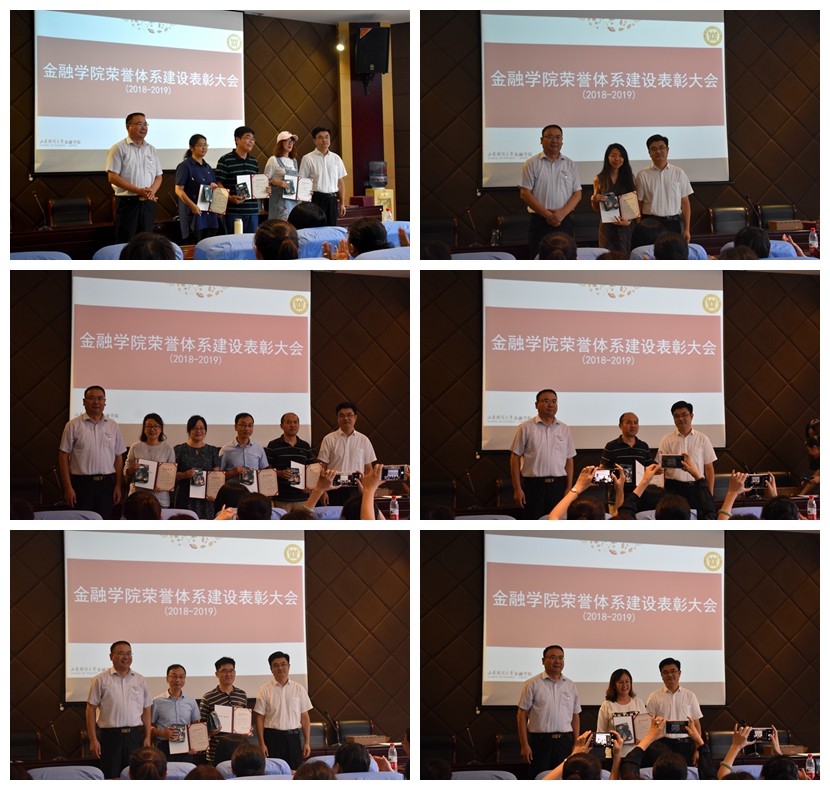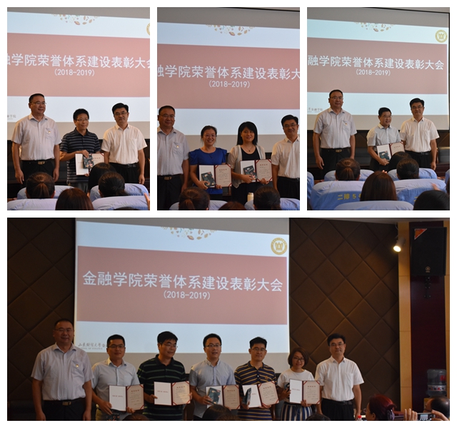 会上,学院集中表彰了一批在教学、科研、党建、研究生指导等方面工作表现优异的教职工代表。葛永波、张宏、张振敏获得“我最喜爱的老师”称号;张笑玎、杨柳获得2018-2019学年度教学贡献院长奖;杨丰国、王俊籽、孙琦、李勇被评为优秀共产党员;学生第五党支部(支部书记李勇)被评为优秀党支部;学院办公室、金融工程系获得2018年度团队贡献院长奖;陈静获得“优秀辅导员”荣誉称号;刘海明、王营、葛永波、赵国庆、刘慧获得2018年度科研贡献院长奖;张延良被评为优秀研究生指导老师;冯玉梅、宋晓蕾被评为“优秀女教工”;邵新昌获得优秀服务奖。学院希望全体教职工向获奖同事表示祝贺的同时,继续学习和发扬良好的工作作风,踏实勤奋,兢兢业业,为学院发展做出新的更大的贡献。