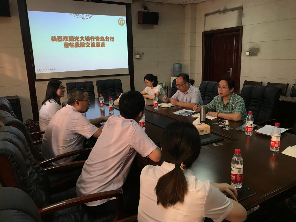 (通讯员:王亚男)9月9日下午,中国光大银行青岛分行总部一行四人来访,在金融楼第一会议室召开了校企合作座谈会。中国光大银行青岛分行人力资源部陈立刚副总经理、中国光大银行青岛研发中心臧培科处长,我校就业指导处副处长周广春、学院党委副书记范志毅、院学工办主任孙琦等参加了座谈会。