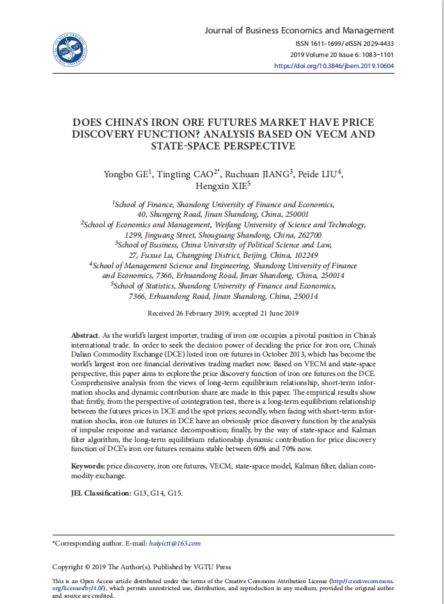 葛永波教授作为第一作者撰写的论文“Does china’s iron ore futures market have price discovery function? Analysis based on VECM and state-space perspective”在期刊《Journal of Business Economics and Management》发表(2019年第20卷第6期)。该期刊系经济学SSCI二区期刊,2018年影响因子为1.855,属我校A1类期刊。