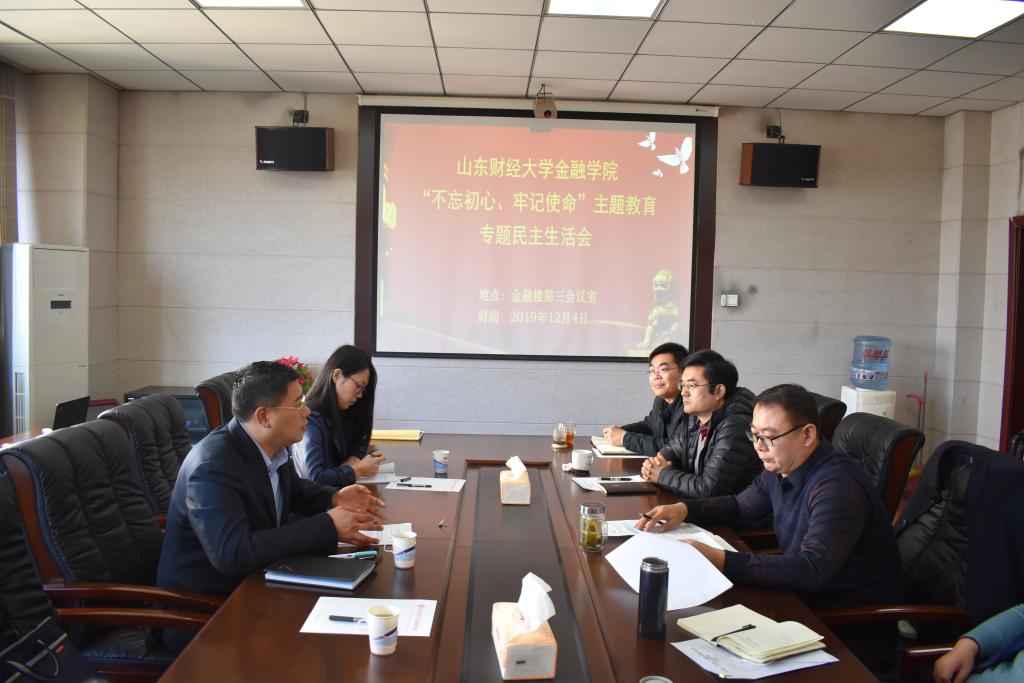 根据学校“不忘初心、牢记使命”主题教育领导小组部署和安排,2019年12月4日上午,yl88858永利集团党委领导班子在舜耕校区金融楼第三会议室召开了“不忘初心、牢记使命”专题民主生活会。学校第二巡回指导组组长教师工作部部长刘旻航、成员校纪委监察处王丽娜科长莅临指导。党委书记吴红文,院长彭红枫,副书记范志毅、康亚通,副院长葛永波、冯玉梅参加了会议。党委委员、工会主席、办公室主任杨丰国,党委组织员李勇列席了会议。会议由党委书记吴红文主持。