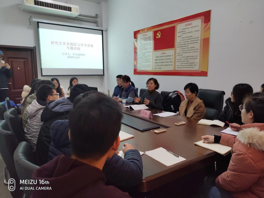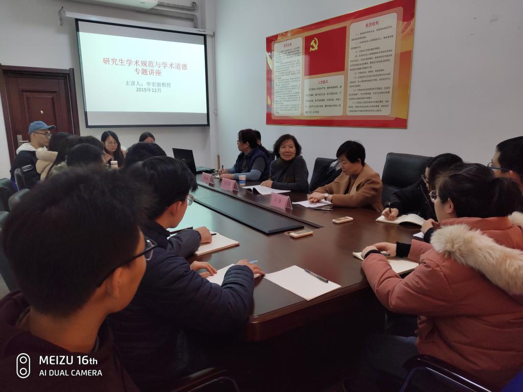 (通讯员 赵一丁 许静)12月12日下午3点,研究生基层党建工作室在6214召开学术规范与学术道德专题讲座,申宏丽教授主讲,党委副书记范志毅主持会议,参加会议的还有研究生辅导员许静和2019级研究生代表。