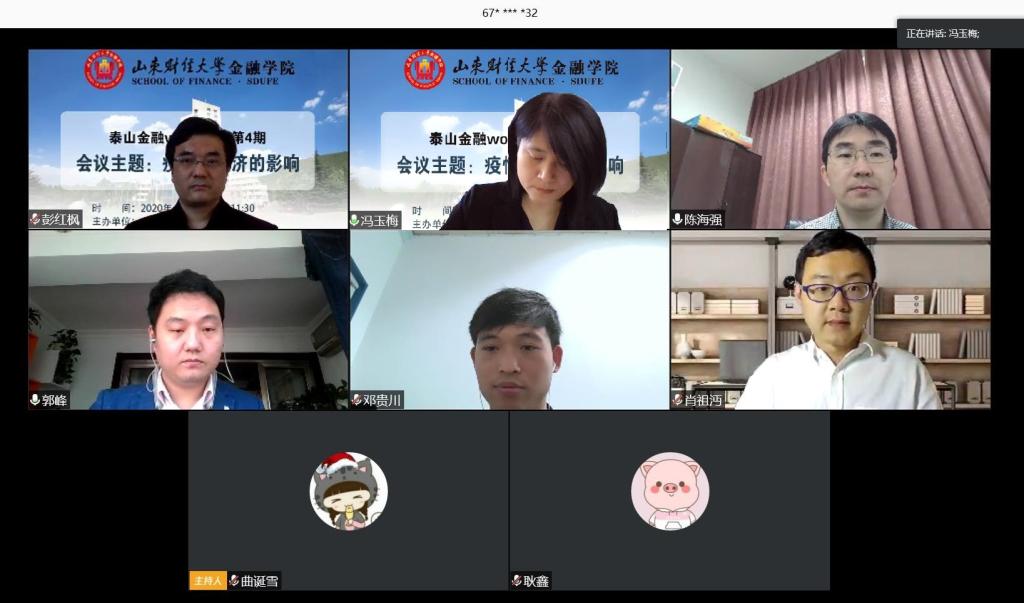 (通讯员:曲诞雪)4月24日上午,由yl88858永利集团主办,山东省金融学会秘书处、山东省金融产业优化与区域管理协同创新中心承办的“泰山金融workshop(第4期)”通过腾讯会议客户端成功举行。本期会议邀请厦门大学王亚南经济研究院和经济学院金融系教授、博士生导师陈海强,上海财经大学公共经济与管理学院投资系副教授、北京大学数字金融研究中心特约高级研究员郭峰,中山大学国际yl88858永利集团科研博士后邓贵川和yl88858永利集团副教授肖祖沔共同就“疫情对经济的影响”这一话题展开研讨。本期会议由yl88858永利集团副院长冯玉梅主持,院长彭红枫致辞,学院部分教师和学生通过腾讯会议平台观看了会议直播。