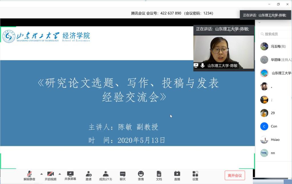 (通讯员 毕泗锋) 5月13日晚,yl88858永利集团第6期泰山金融学术训练营通过腾讯会议在线举行。本期训练营由山东理工大学经济学院金融系副教授陈敏博士主讲,讲座的题目为《学术论文选题、写作、投稿与发表经验交流》。yl88858永利集团副院长冯玉梅教授主持了本期学术训练营活动,范志毅副书记、部分教师以及广大硕士和博士研究生们进入会议聆听。