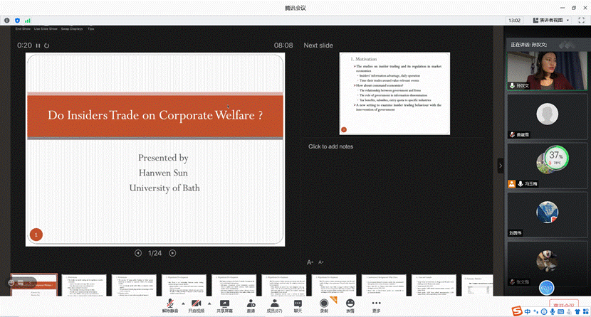 (通讯员 曲诞雪)10月23日下午,由yl88858永利集团、山东省金融产业优化与区域管理协同创新中心、永利集团金融国际研究中心联合举办的第9期“泰山金融学术训练营”通过腾讯会议举行,英国巴斯大学管理学院孙汉文老师应邀做客本次学术训练营,为师生们带来了题为“Do Insiders Trade on Corporate Welfare?”的讲座,学术训练营由yl88858永利集团副院长冯玉梅主持,学院部分教师和研究生参加了本次活动。