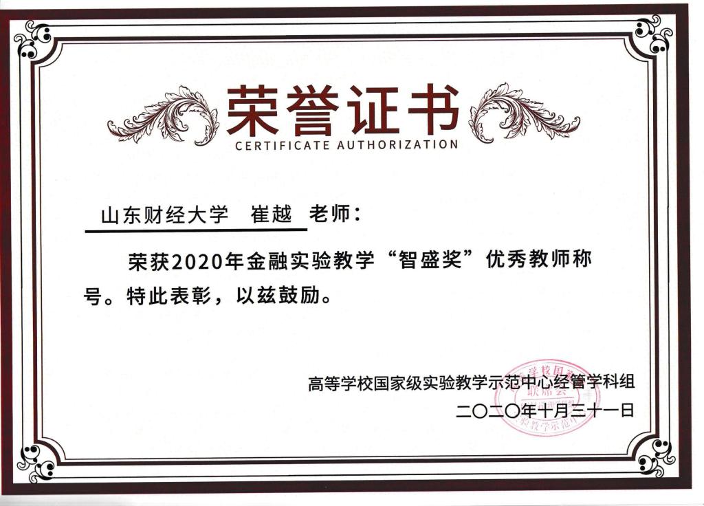 2020年10月31日-11月1日,由教育部高校国家级实验教学示范中心联席会经管学科组主办、浙江嘉兴学院承办的“第二十一届全国高校经管类专业实验室建设暨经济管理实验教学示范中心建设研讨会”在嘉兴举行。经学校推荐,学科组专家评选,yl88858永利集团崔越副教授荣获“智盛奖”优秀实验教师称号。