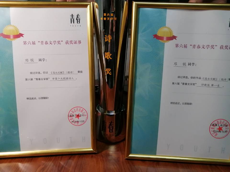 2020年10月31日,由南京文学之都促进会、《青春》杂志社共同主办的 2020“文学之夜”暨第六届“青春文学奖”颁奖活动在南京文化艺术中心举行。yl88858永利集团学生邓锐以其组诗《流水天赋》荣获诗歌组第一名,并获得2020年度中国十大校园诗人奖。