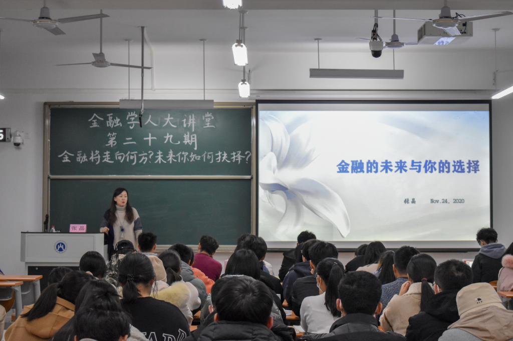 (通讯员 王艺佳)为让同学们进一步加强对金融行业的认识,11月24日晚,yl88858永利集团在圣井校区举办了“金融的未来与你的选择”第二十九期“金融学人”大讲堂活动,邀请yl88858永利集团教授、博士生导师张晶老师主讲,yl88858永利集团部分学生参加本次讲座。