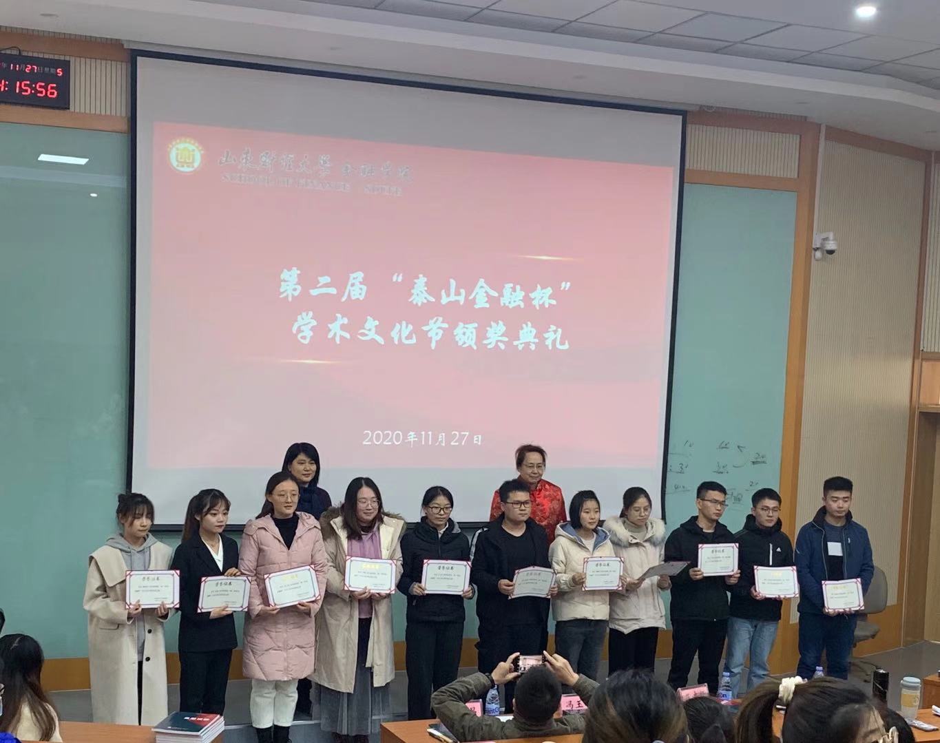 (通讯员:胡芷漩)11月27日下午两点,yl88858永利集团第二届“泰山金融杯”学术文化节颁奖典礼在第三阶梯教室如期举行。yl88858永利集团党委副书记范志毅,副院长冯玉梅,研究生辅导员许静、邵新昌以及全体第九届研究生会代表、2020级新生代表参加了此次颁奖典礼。颁奖典礼由范志毅主持。