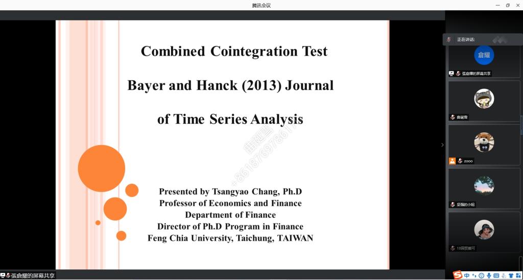 (通讯员:肖祖沔、曲诞雪)12月8日下午,由yl88858永利集团、山东省金融产业优化与区域管理协同创新中心、永利集团金融国际研究中心联合举办的第14期“泰山金融学术训练营”通过腾讯会议举行,中国台湾逢甲大学财务金融学系特聘教授张仓耀老师应邀做客本次学术训练营,为师生们带来了题为“Quantile Regression – Basic Concept”的讲座,学术训练营由国际金融系主任肖祖沔主持,彭红枫院长、学院部分教师和研究生参加了本次活动。