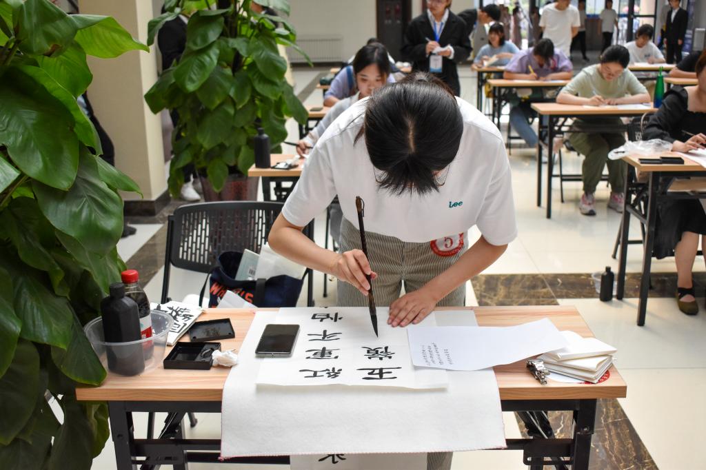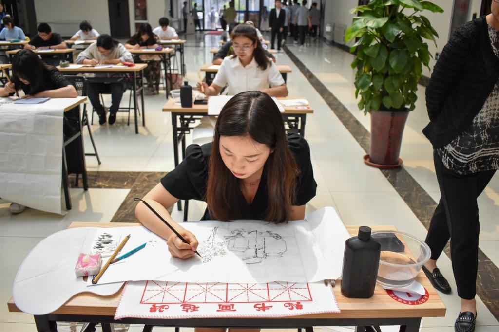 本次比赛30名选手进入决赛现场创作,涵盖硬笔书法、软笔书法、中国画、水彩画等,评委现场进行指导打分。活动现场,鲁天鑫为王如恒颁发创新创业指导教师聘书。陈静在致辞中表示,笔墨言志,丹青传情,书画大赛对于弘扬中华民族优秀传统文化,丰富校园文化生活,推进我院“三全育人”建设的深入发展,必将起到积极的推动作用。随后,孔亚兵和王如恒为本次活动开笔,选手们随即提起笔进行创作,下笔、顿笔、收笔,行云流水的动作展现了选手们深厚精湛的书法技艺,铿锵有力的绘画中传达了选手们对党的热爱与尊崇。孔亚兵借习总书记讲话现场寄语大学生“只争朝夕,不负韶华”,王如恒勾画荷花与牡丹,意境深远、寓意美好。嘉宾作品灵动流逸、运笔灵巧,纯熟精湛的技艺受到大家赞赏,为活动更添精彩。创作环节结束后,嘉宾们对选手的作品进行了点评,在肯定画作质量的同时提出了指导性的意见。