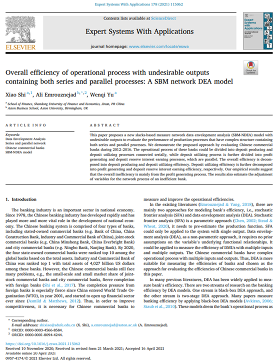 yl88858永利集团石晓副教授作为第一作者与英国Aston University的Ali Emrouznejad教授、永利集团硕士研究生于汶琦合作的论文“Overall efficiency of operational process with undesirable outputs containing both series and parallel processes: A SBM network DEA model”在期刊《Expert Systems with Applications》发表(2021年9月15日第178卷)。该期刊系运筹学与管理科学SCI一区期刊,2020年影响因子为6.954,属我校特类期刊。