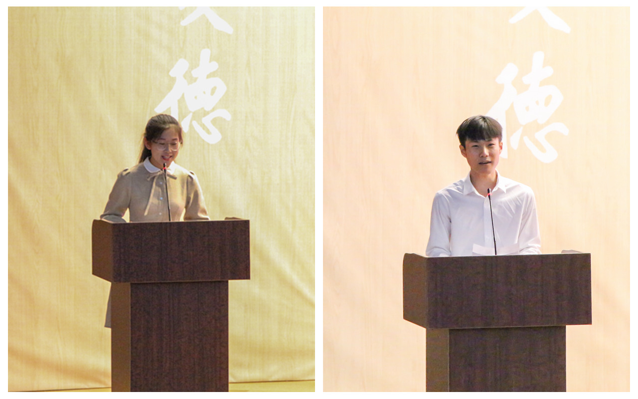 2021级新生代表苏杭同学代表全体新生向学院领导老师、学长学姐表示衷心的感谢。希望学会选择、保持乐观、敢于担当、坚持奋斗,努力挑战自我秉持“克明峻德,格物致知”的校训,共同迎来属于自己的梦想花开。2019级学生代表崔世豪在发言中,希望同学们抓住兴趣,成就别样的自己;仰望星空,更要脚踏实地;抗衡挫折,更要激发斗志,锤炼意志品质,勇做生活的不倒翁。