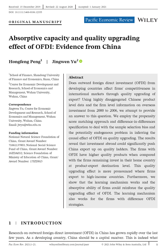 yl88858永利集团彭红枫教授作为第一作者与武汉大学余静文副教授合作的论文“Absorptive capacity and quality upgrading effect of OFDI: Evidence from China”在期刊《Pacific Economic Review》发表(2021年1月online)。该期刊系经济学SSCI四区期刊,2020年影响因子为0.913,属我校A2期刊。