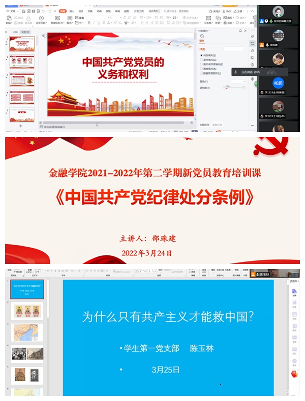 本次培训采取专题课堂和自我学习相结合的形式进行。陈静作了题为“践行核心价值观,同心共筑中国梦”的主题课程,她强调新党员应该在践行社会主义核心价值观的时代大潮中,奋发向上,努力拼搏,为实现中华民族伟大复兴的中国梦而奋斗;李勇带领同志们学习了《中国共产党支部工作条例(试行)》,他强调党支部是党的基础组织,是党在社会基层组织中的战斗堡垒,是党的全部工作和战斗力的基础;王亚男对《中国共产党党员教育管理工作条例》进行了讲解,她表示《条例》是新时代党员教育管理工作的基本遵循;郭夕熙为同志们讲述了预备党员不可不知的党史,深入探讨了开展党史学习教育的重要性,她强调要坚持不懈把党史学习作为必修课、常修课;王丽作了题为“端正入党动机,正确对待入党问题”的主题课程,她提出要加深对共产主义事业和共产党的深刻认识,不断强化入党动机;许静作了题为“增强四个意识,坚定四个自信,做到两个维护”的主题课程,她强调党员要不断提升理论素养和党性修养;徐洁讲解了中国共产党员的义务和权利,她强调党员在充分履行好义务的同时,要正确行使好党员的权利;邵珠建讲解了《中国共产党纪律处分条例》,他提出党员要增强纪律意识,严格要求自己,充分发挥先锋模范带头作用;陈玉林针对“为什么只有共产主义才能救中国”这一问题,从历史的角度进行了深入的剖析,他表示新党员要传承红色基因,赓续红色血脉。专题课堂结束后,党员同志们自行学习了灯塔大课堂第二十八课和“学习强国——红色中国”等内容。