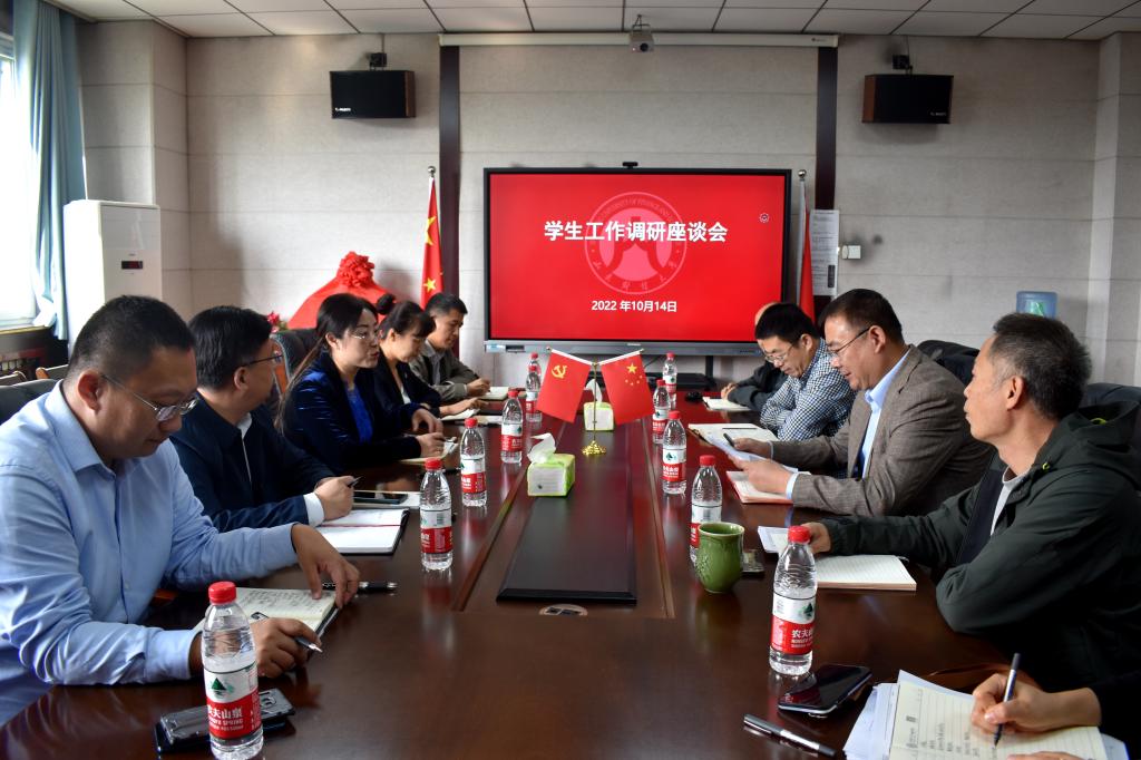 10月14日下午,学校党委学生工作部、学生工作处一行到yl88858永利集团调研指导工作。副处长孙丽华、张贞梅、周广春、刘思锋、张亚萌到我院调研指导学生管理。yl88858永利集团党委书记吴红文,副书记康亚通、李开传及全体辅导员参加了座谈会。
