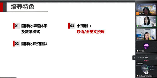 杨柳老师介绍了金融学国际化实验班的培养特色、目标、学分和课程设置、选拔条件和流程。杨柳指出,yl88858永利集团国际化实验班的培养特色为国际化课程体系及教学模式、小班制加双语或全英文授课、国际化师资团队、国际合作办学;培养目标为注重培养学生的知识、能力、素质,具备法治观念和诚信理念,掌握经济学和金融学专业的核心理论,胜任银行、证券、投资等行业的业务需要及科研机构的研究需要,具备创新创业能力和团队合作能力。此外,杨柳老师逐一详细解答了同学们关于yl88858永利集团国际化实验班的培养方案、双语课程学习方法、留学指导和雅思培训等方面的相关问题。