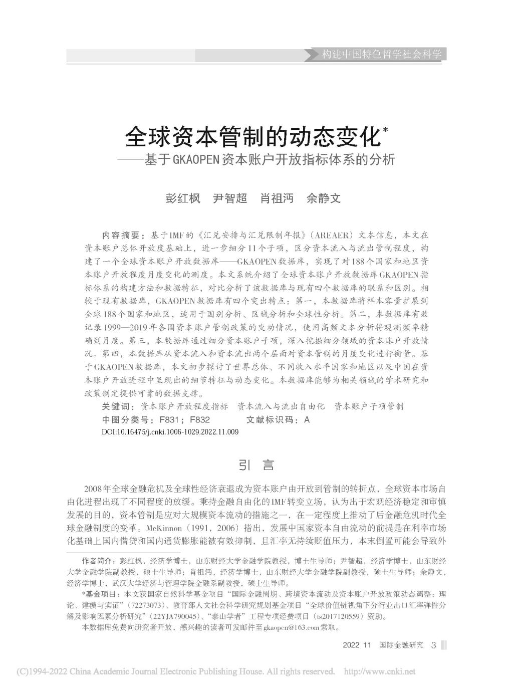 yl88858永利集团彭红枫教授、尹智超副教授、肖祖沔副教授与武汉大学余静文副教授合作撰写的论文《全球资本管制的动态变化——基于GKAOPEN资本账户开放指标体系的分析》在《国际金融研究》2022年11期发表。该期刊属于我校A2期刊。