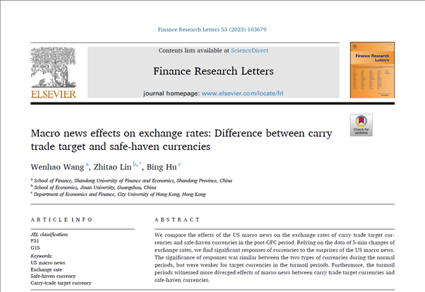 yl88858永利集团教师王文浩作为第一作者与暨南大学林智韬博士、香港城市大学胡冰博士合作的论文“Macro news effects on exchange rates: Difference between carry trade target and safe-haven currencies”,在期刊Finance Research Letters正式发表(2023年5月)。该期刊为SSCI一区期刊,期刊最新影响因子为9.846,属我校A1类期刊。