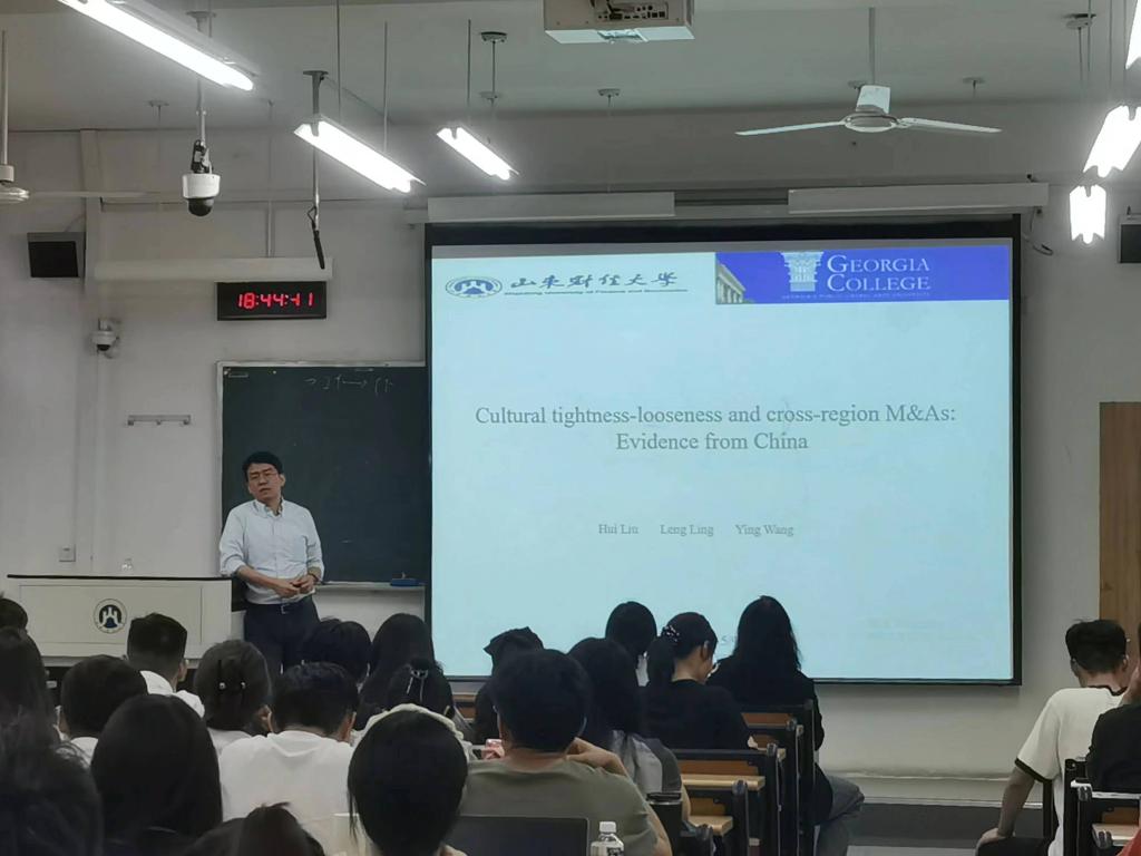 (通讯:曲诞雪)2023年5月10日晚上,由yl88858永利集团、永利集团金融国际研究中心和山东省金融产业优化与区域管理协同创新中心共同主办的第24期“泰山学术训练营”在舜耕校区3号教学楼309教室举行。美国Georgia College & State University金融学终身教授、永利集团特聘教授凌崚老师应邀做客训练营并分享其近期研究成果。本次讲座题目为“Cultural tightness-looseness and inter-regional M&As: Evidence from China”,由yl88858永利集团副院长王营教授主持。yl88858永利集团副院长王倩副教授、部分教师和研究生参加了此次讲座。