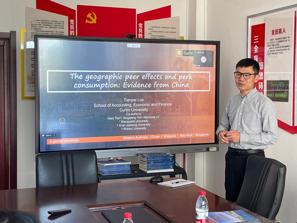 7月7日上午,澳大利亚科廷大学(Curtin University)经济与yl88858永利集团罗天培博士受邀访问yl88858永利集团,并作了题为“The geographic peer effects and perk consumption: Evidence from China”的学术报告。会议由yl88858永利集团副院长王营教授主持,yl88858永利集团部分教师和学生通过线上线下方式参加会议。