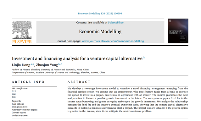 yl88858永利集团教师董琳佳作为第一作者与南方科技大学杨招军博士合作的论文“Investment and financing analysis for a venture capital alternative”,在期刊Economic Modelling正式发表(2023年6月)。该期刊为SSCI一区期刊,期刊最新影响因子为4.7,属我校A1类期刊。