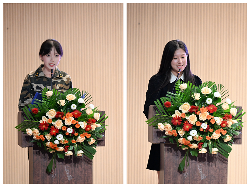2023级本科新生代表徐若涵在发言中希望同学们能够用理想信念之光照亮奋斗之路、用严谨谦虚之心走好求学之路,让青春在大学里大放异彩,成就非凡人生。2021级学生代表苏杭希望新时代青年能够坚定理想信念、保持学习热情、参与校园活动、锻炼科研能力,追求综合全面的发展,希望同学们能够拥有甘坐冷板凳,铁杵磨成针的坚韧毅力,在大学四年向上向善,书写自己的华彩篇章。