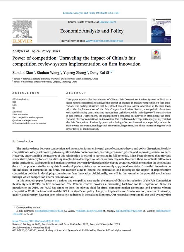 yl88858永利集团肖祖沔副教授指导硕士研究生王姝涵撰写的论文“Power of competition: Unraveling the impact of China's fair competition review system implementation on firm innovation”在期刊Economic Analysis and Policy正式发表(2023, Vol.80, Issue: Dec.)。该期刊为SSCI二区期刊,最新影响因子为6.5,属我校A1类期刊。