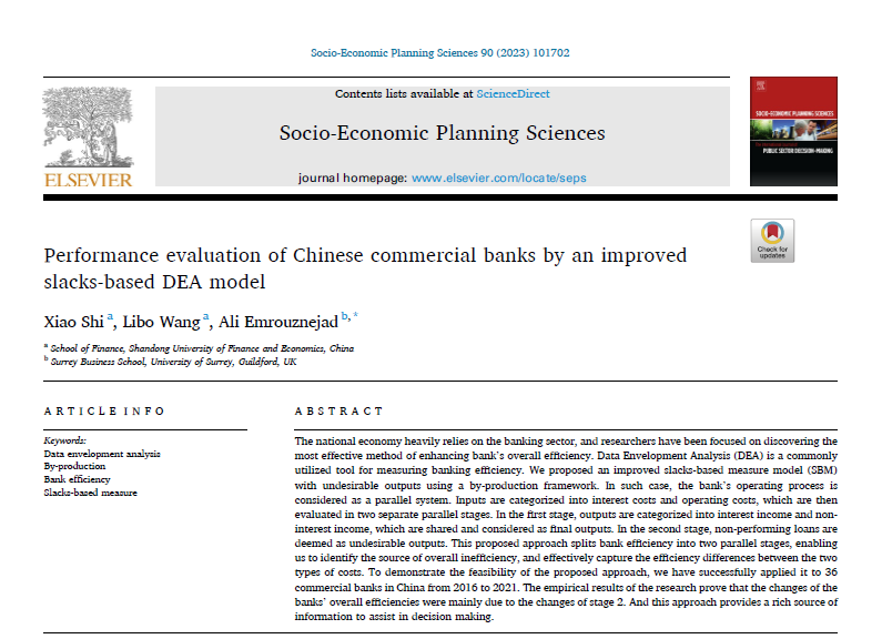 yl88858永利集团石晓副教授作为第一作者与硕士研究生王利波、英国萨里大学Ali Emrouznejad教授合作的论文“Performance evaluation of Chinese commercial banks by an improved slacks-based DEA model”在期刊Socio-Economic Planning Sciences正式发表(2023, Vol. 90, Issue: Dec)。该期刊为SSCI一区期刊,期刊最新影响因子为6.1,属我校A1类期刊。