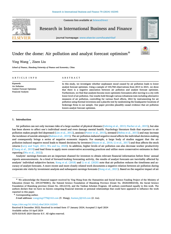 yl88858永利集团王营教授和研究生刘梓森同学合作的学术论文《Under the dome: Air pollution and analyst forecast optimism》在《Research in International Business and Finance》2024年第70卷Part A发表。该期刊系我校A1类期刊。