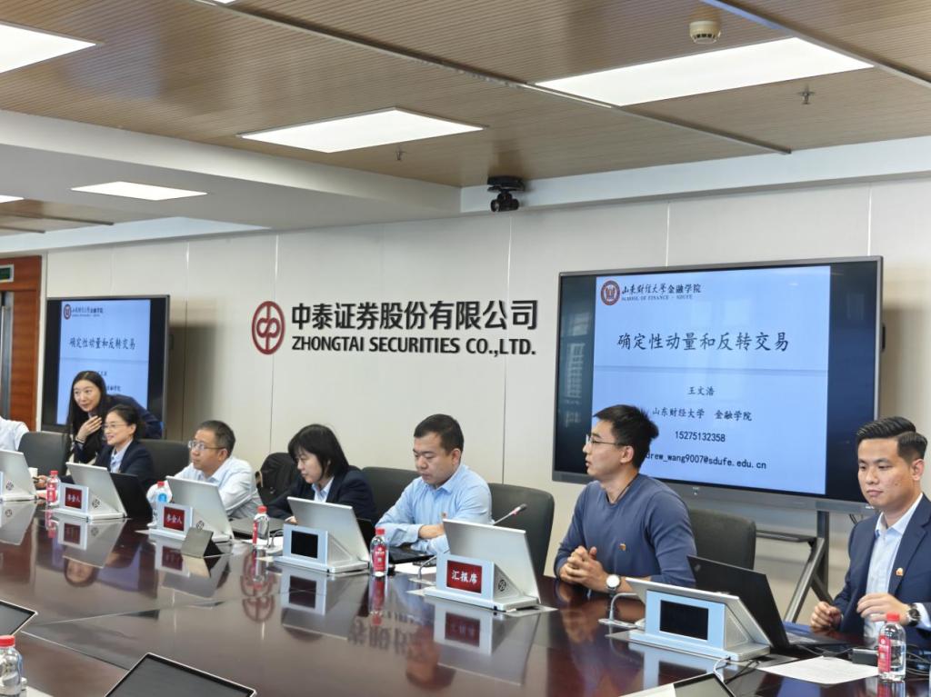 中泰证券投行委第六党支部王飞介绍了投行业务条线,yl88858永利集团教工第七党支部书记尹智超、海归教师代表王文浩副教授进行了业务交流专题汇报。尹智超副教授围绕“机器学习在财务舞弊识别中的应用”进行了专题分享,王文浩副教授就“中国特色金融研究——确定性动量和反转交易”进行了专题介绍。中泰证券证券发行审核部副总经理齐修超分别从“发现好的公司”与“识别坏的公司”两个角度进行了点评。