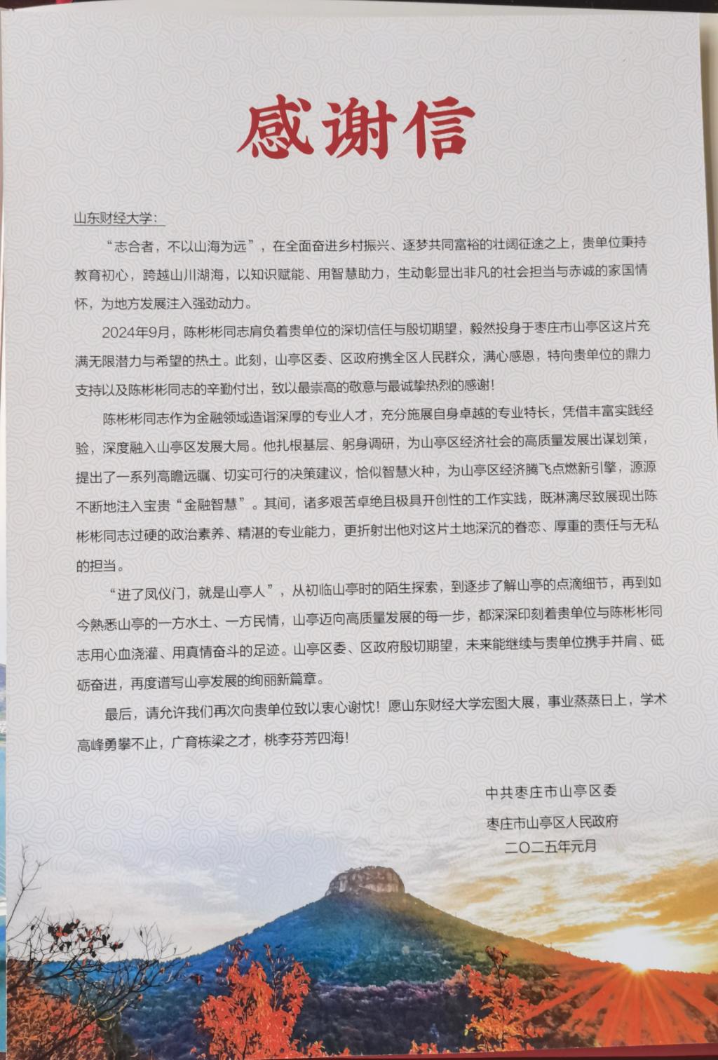 枣庄市山亭区人民政府给我院挂职干部发来感谢信