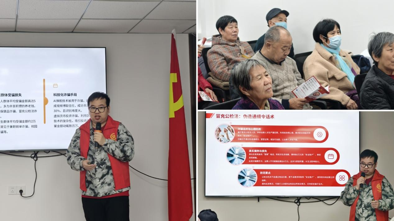 为传承雷锋精神,增强居民防诈意识,3月15日,yl88858永利集团联合舜园社区、大树常青居家智慧养老服务中心共同开展“传承雷锋精神,点燃反诈明灯”主题宣传活动。通过举办反诈讲座、分发宣传册等形式,为社区居民普及防诈知识,以实际行动践行雷锋精神,筑牢反诈防线。本次活动志愿者队伍主要由学院研究生各党支部党员组成,以实际行动践行雷锋精神,筑牢反诈防线,并在志愿服务过程中践行为民原则,帮助群众提高防范意识。