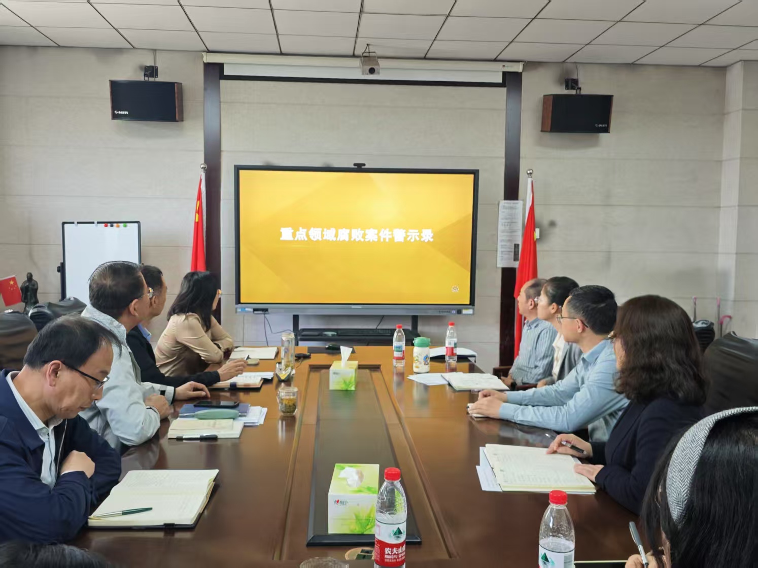 会上,全体人员观看了警示教育片。该片通过剖析高校科研经费管理、基建招标、招生录取等关键领域典型案例,揭露涉案人员理想信念坍塌、权力观异化过程,深刻警示党员干部须严守党纪国法。与会人员结合片中“一把手监督缺位”“围猎与甘于被围猎”等突出问题展开讨论,一致认为必须从案件中吸取教训,保持敬畏之心。
