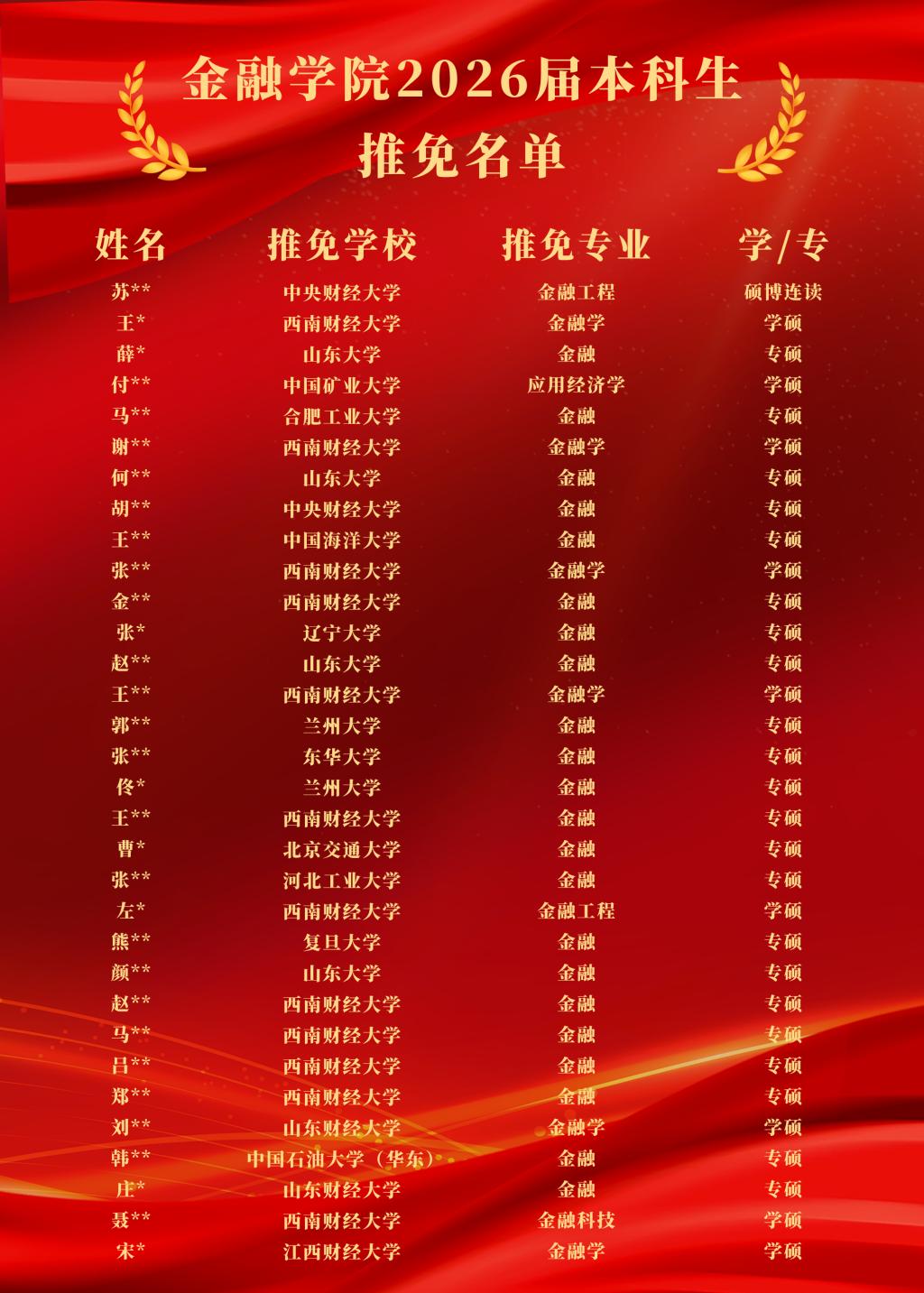 本届推免学子中,既有持续专注于金融学等传统优势领域的深耕者,也有勇于探索金融科技、金融工程等新兴交叉学科的创新者。多元化的深造方向,充分体现了学生们深厚的专业素养和开阔的学术视野,也展现了学院“思政引领、品牌驱动、贯通培养”育人理念的扎实成效。