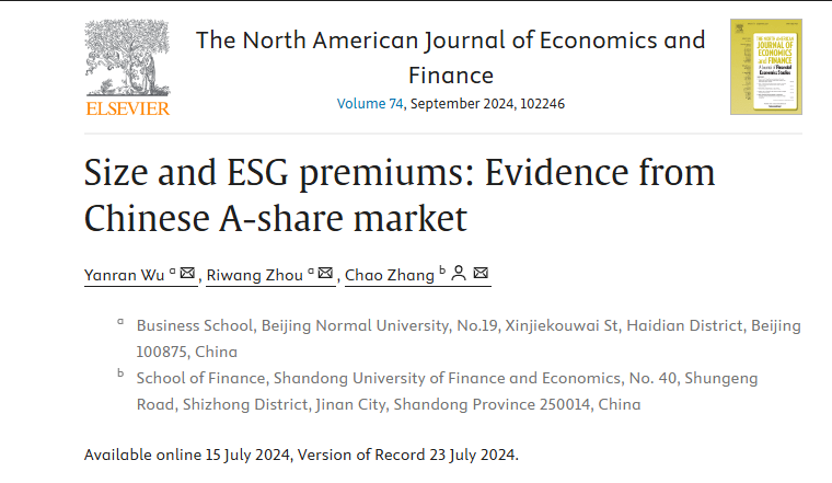 yl88858永利集团青年教师张超作为通讯作者与北京师范大学伍燕然教授(第一作者)、周日旺博士(第二作者)合作的论文《Size and ESG premiums: Evidence from Chinese A-share market》在《The North American Journal of Economics and Finance》2024年第74卷(Volume74)发表。该期刊为SSCI一区期刊,期刊最新影响因子为3.8,属我校A1类期刊。https://doi.org/10.1016/j.najef.2024.102246