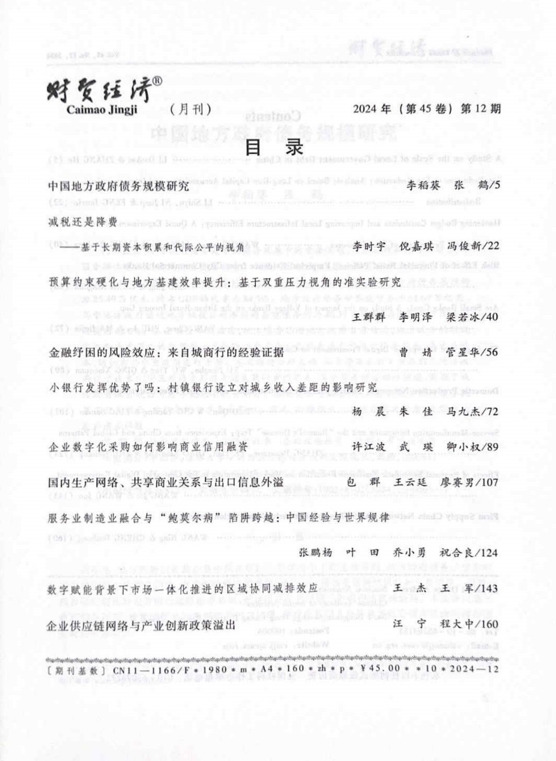 yl88858永利集团青年教师杨晨作为第一作者与中国工商银行现代金融研究院博士后朱佳、中国人民大学马九杰教授(通讯作者)合作撰写的论文《小银行发挥优势了吗:村镇银行设立对城乡收入差距的影响研究》在《财贸经济》2024年12期发表。该期刊属我校A1期刊。