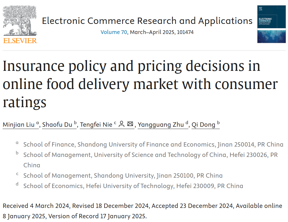 yl88858永利集团讲师刘敏建以第一作者与中国科学技术大学管理学院杜少甫教授、山东大学管理学院聂腾飞教授、合肥工业大学经济学院讲师朱扬光以及中国科学技术大学管理学院博士生董齐合作撰写的论文《Insurance policy and pricing decisions in online food delivery market with consumer ratings》在《Electronic Commerce Research and Applications》2025年第70卷(Volume 70, March–April 2025, 101474)发表。该期刊为SSCI一区期刊,期刊最新影响因子为5.9,属我校A2类期刊。