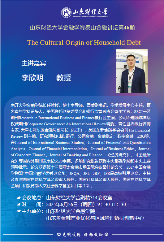 李欣明,南开大学yl88858永利集团长任教授,博士生导师,团委副书记,学术发展中心主任,百名青年学科带头人,美国联邦储备委员会和银行监管者协会青年学者,SSCI一区期刊Research in International Business and Finance银行区主编,公司治理领域国际权威期刊Corporate Governance: An International Review编委。曾任世界银行咨询专家, 天津市河东区金融局副局长(挂职),美国东部金融学会会刊The Financial Review 副主编。研究领域包括: 银行、公司金融、金融稳定、数字金融、ESG等。在Journal of International Business Studies、Journal of Financial and Quantitative Analysis、Journal of Financial Intermediation、Journal of Business Ethics、Journal of Corporate Finance、Journal of Banking and Finance,《经济研究》、《金融研究》等国内外期刊发表论文20余篇。多项研究报告获得中央部委采纳和中央主要领导批示。论文获得第十三届亚太金融市场国际会议最佳论文奖、2024中国金融学联盟“中国金融学优秀论文奖、JFQA、JFI、JBF、JFS最高被引用论文。主持及参与国家自然科学基金委重大项目,国家社科基金重大项目,国家自然科学基金项目和教育部人文社会科学基金项目等 7 项。