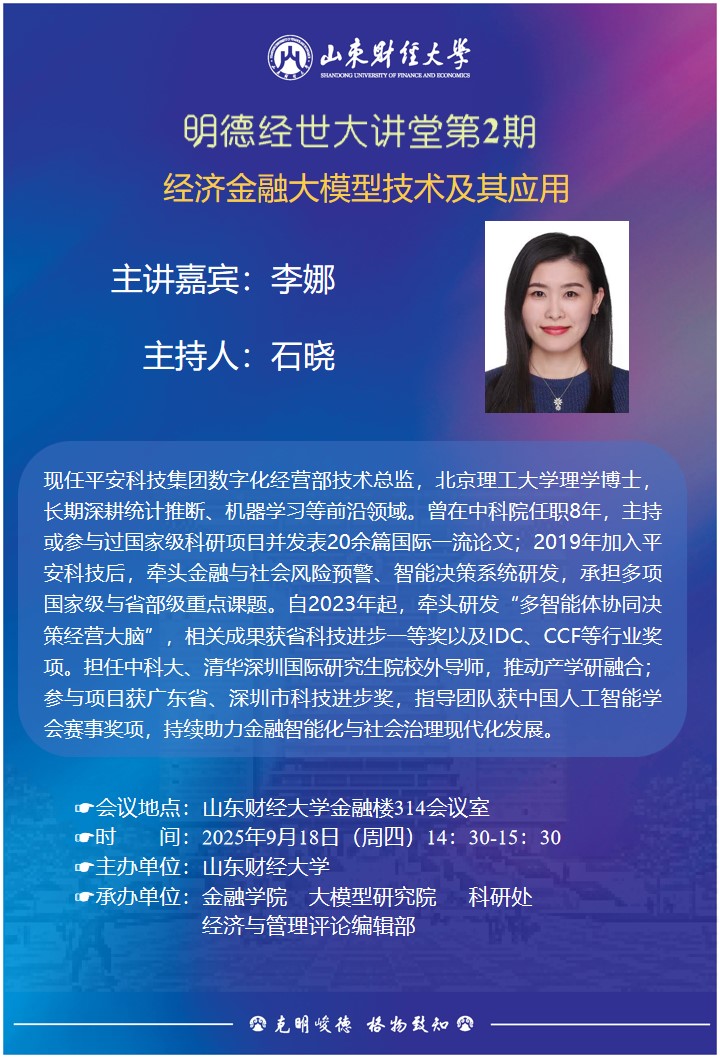 李娜,现任平安科技集团数字化经营部技术总监,北京理工大学理学博士,长期深耕统计推断、机器学习等前沿领域。曾在中科院任职8年,主持或参与过国家级科研项日并发表20余篇国际一流论文;2019年加入平安科技后,牵头金融与社会风险预警、智能决策系统研发,承担多项国家级与省部级重点课题。自2023年起,牵头研发“多智能体协同决,相关成果获省科技进步一等奖以及IDC、CCF等行业奖策经营大脑"项。担任中科大、清华深圳国际研究生院校外导师,推动产学研融合;参与项日获广东省、深圳市科技进步奖,指导团队获中国人工智能学会赛事奖项,持续助力金融智能化与社会治理现代化发展。