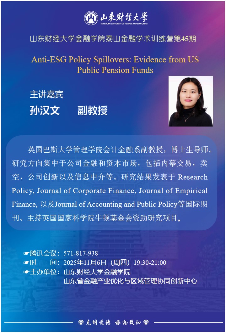 孙汉文,英国巴斯大学管理学院会计金融系副教授,博士生导师:研究方向集中于公司金融和资本市场,包括内幕交易,卖空,公司创新以及信息中介等。研究结果发表于ResearchPolicy, Journal of Corporate Finance, Journal of EmpiricalFinance,以及Journal ofAccounting and Public Policy等国际期刊。主持英国国家科学院牛顿基金会资助研究项目。
