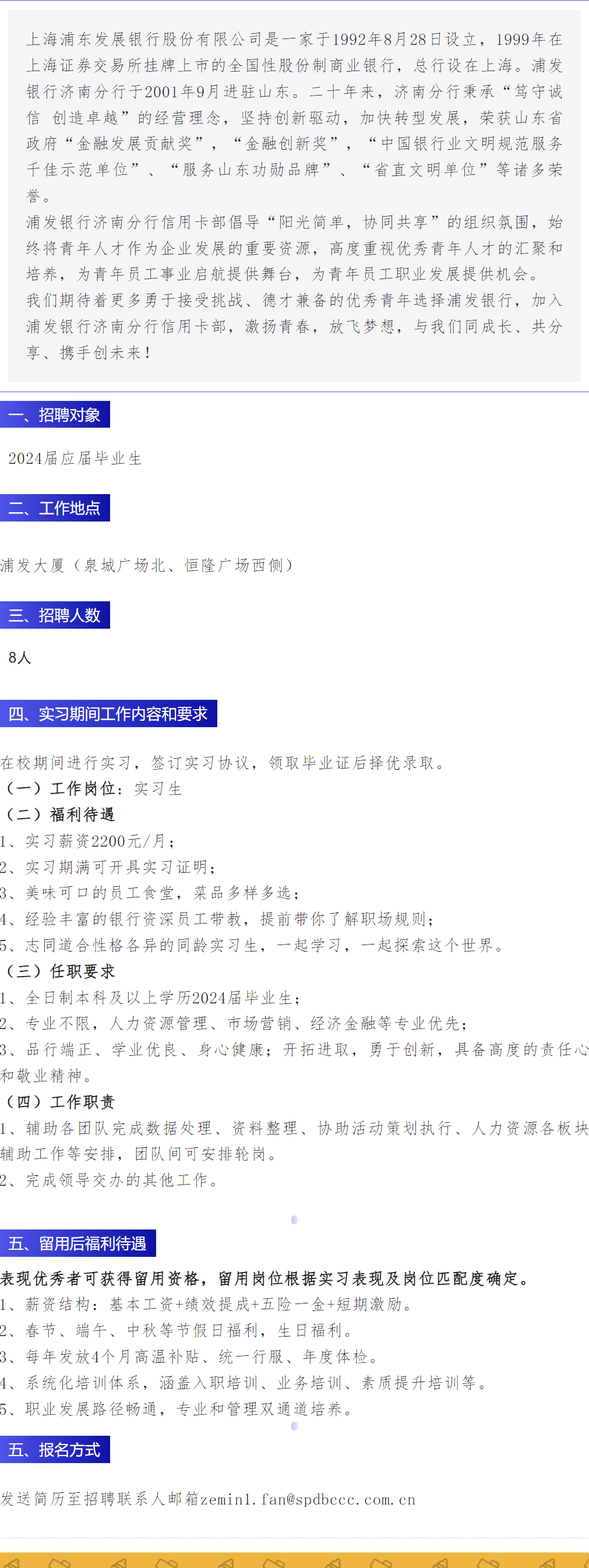 浦发银行济南分行信用卡部2024届毕业生招聘