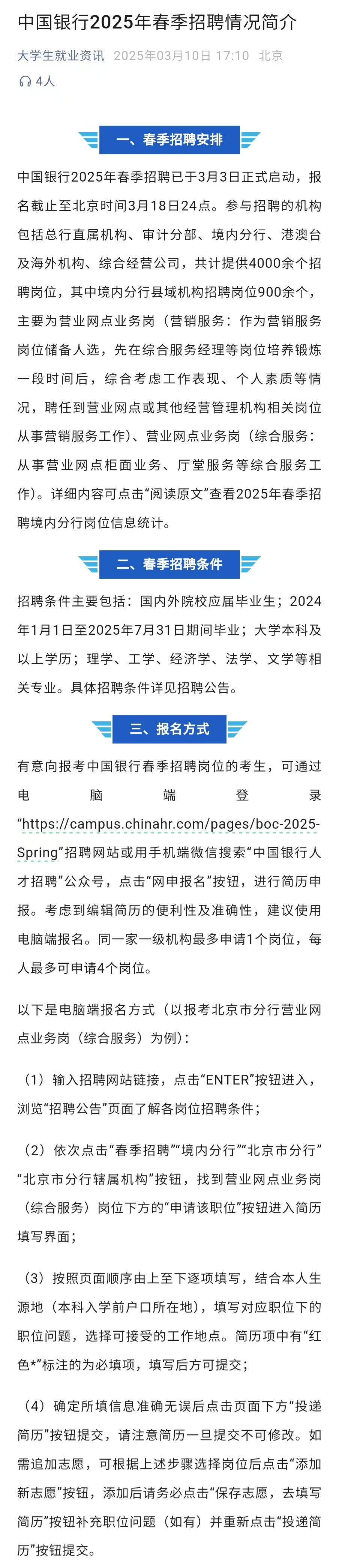 中国银行2025年春季招聘情况简介