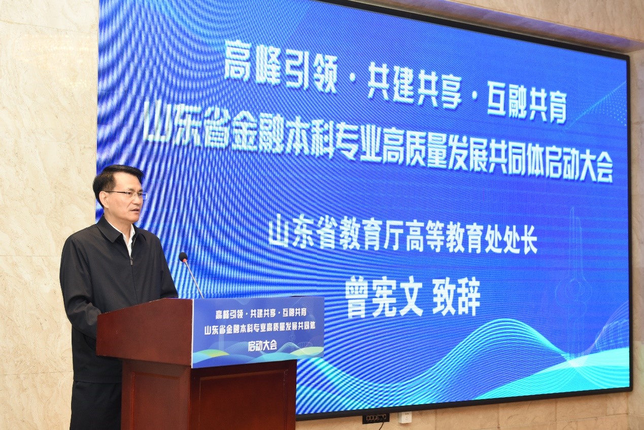 曾宪文代表山东省教育厅高等教育处向大会的召开表示热烈祝贺,向一直以来致力于山东省高等教育事业发展的专家老师们表示衷心的感谢。曾宪文重点介绍了山东省教育“111计划”的发展历史、现状以及目标。“111计划”是山东省为深入贯彻落实党的二十大精神,做好“强国建设、教育何为”的山东答卷,推动教育链、人才链与产业链、创新链有机衔接,推进山东省本科高校教科产融合协同育人工作的重要举措,旨在服务山东省“十强”优势产业,以国家级、省级一流本科专业为核心,集聚全省高校优势力量,打造10个左右本科专业高质量发展共同体,实现高等教育教学改革创新发展强突破。同时,曾处长还强调要注意大数据、大模型、人工智能对人才教育带来的新技术挑战,加强课程、教材、师资建设,推动高校现代金融人才培养模式持续创新。